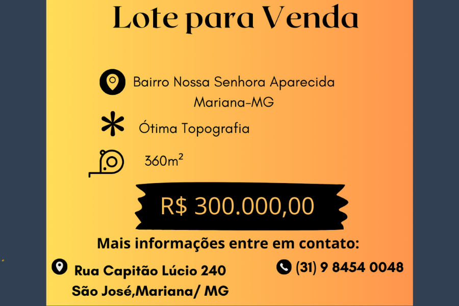 Oportunidade única! Lote de 360 m² à venda no Bairro Nossa Senhora Aparecida, em Mariana/MG. Destaca-se pela ótima topografia, ideal para a construção da casa dos seus sonhos com facilidade.
